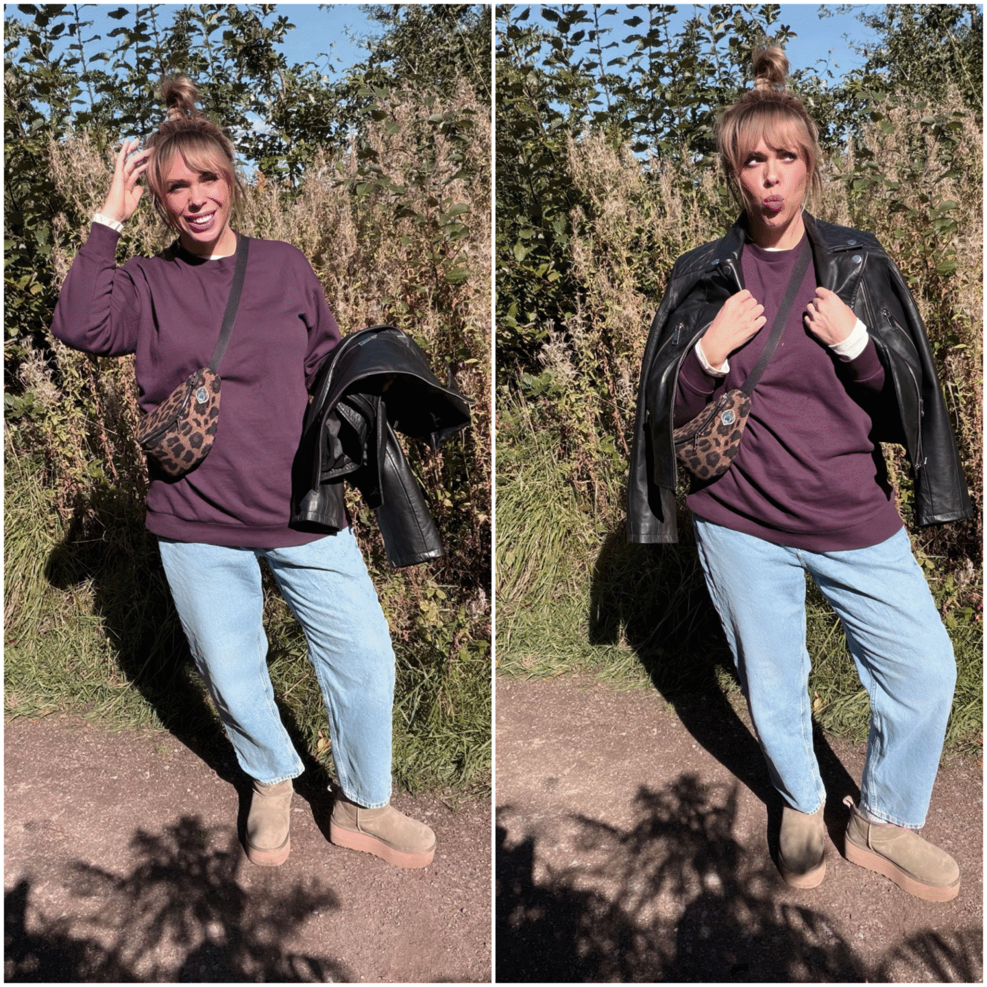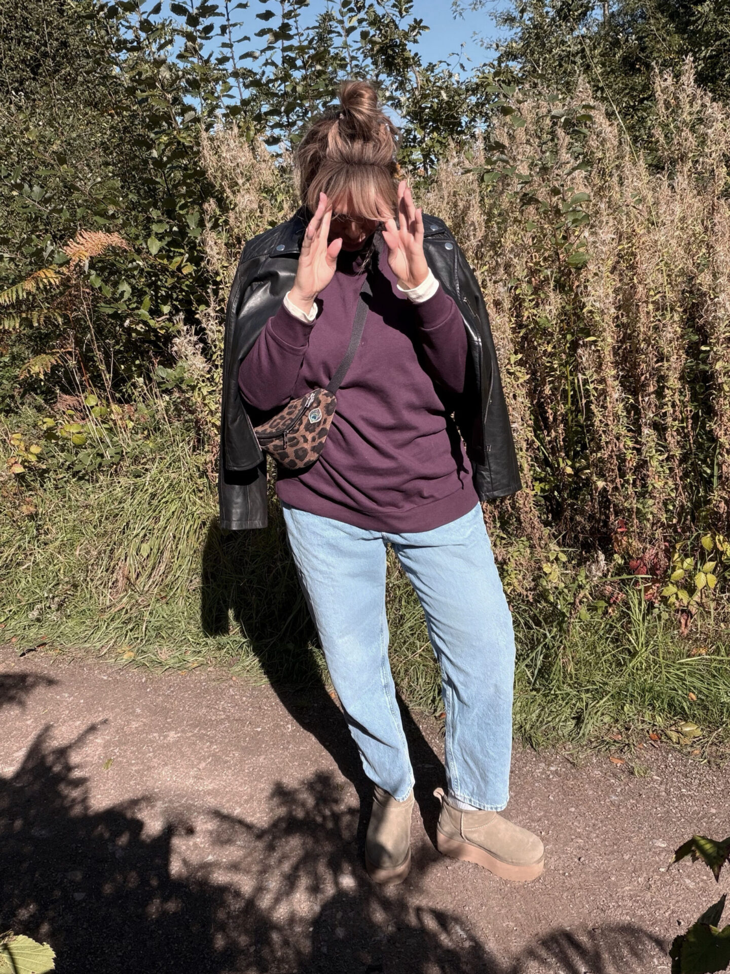 Chucking on something over the other and over the other – it sometimes works in mysterious ways! The most unusual combinations can really work and you don’t know until you’ve tried it. Think clashing prints and colours and also experimenting with colours that you never thought would work for you. I like to grab out items from my wardrobe and chuck them across my bed and just start marrying things together until it looks like it could work. This is especially good with summer prints, or at least, things that you categorise as summer prints – take a step back and look at things with a clean slate and think how someone else may style it. There is a lot of misses but you will find unlikely combinations that work! Perhaps a jacket you fell out of love with 4 years ago (hello black leather biker jacket as below) can be something that will now work for you.Embrace the weather and know that you may get a bit wind-swept, possibly wet and muddy. I often opt for an easy up-do that is more adverse weather friendly and so much quicker to style – everything can be a little more un-done and care-free in my opinion.