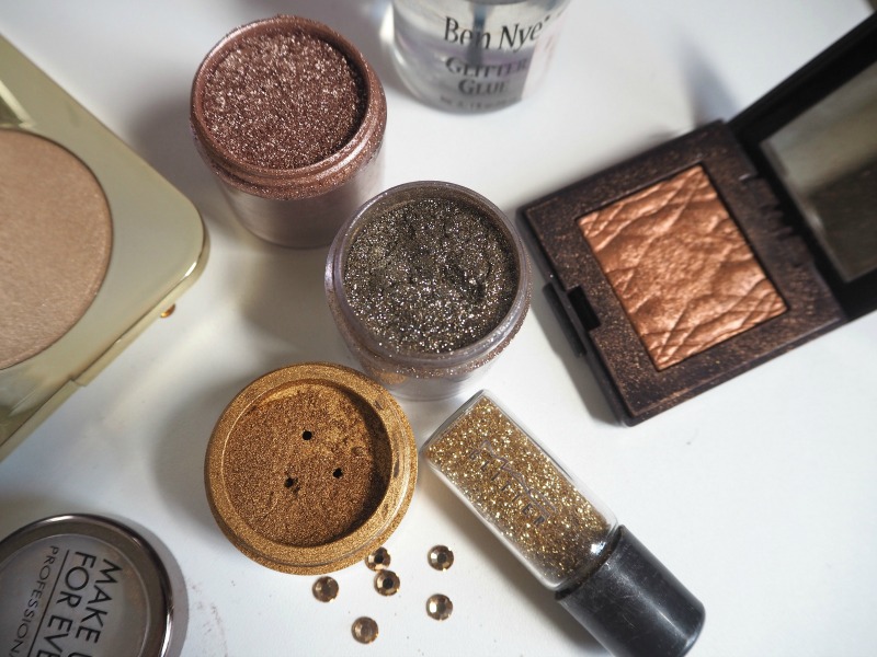 Make Up For Ever Metal Powder ‘Maize Gold’, MAC Pigment in Tan, MAC reflects Antique gold, MAC gold glitter, Ben Nye Glitter glue, Gold diamantes from a craft shop, Shu Uemura Farfallina lashes, NYX HD concealer, Make Up For Ever HD Foundation Stick, Laura Mercier Translucent Powder, BECCA Jaclyn Hill Champagne Palette, Makeup Atelier Paris Longwear Lip Colour ‘Camelia’, Urban Decay VICE lipstick ‘Unicorn’