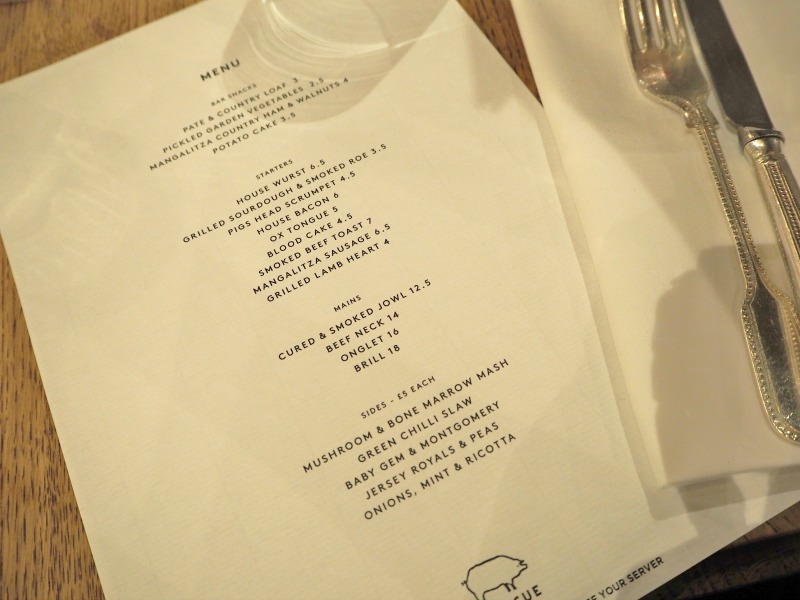 Pitt Cue started off as food truck on London’s South Bank in 2011 serving up smoked brisket , BBQ pulled pork, beans, slaw n’ sides . Fast forward and they now have matured into a full-blown (and pretty large) restaurant & bar with it’s own on-site beer brewing. It still has the BBQ influence yet has grown-up and advanced on from the pulled pork trend that let’s just say is pretty overdone with eateries and pop ups in London right now. Let’s get one thing out of the way, this is not a vegetarian-friendly restaurant, so if you are, stay away or be prepared to just order off the sides menu. It is VERY meat-heavy although they usually will offer 1-2 fish dishes per day off their ever-changing menu.