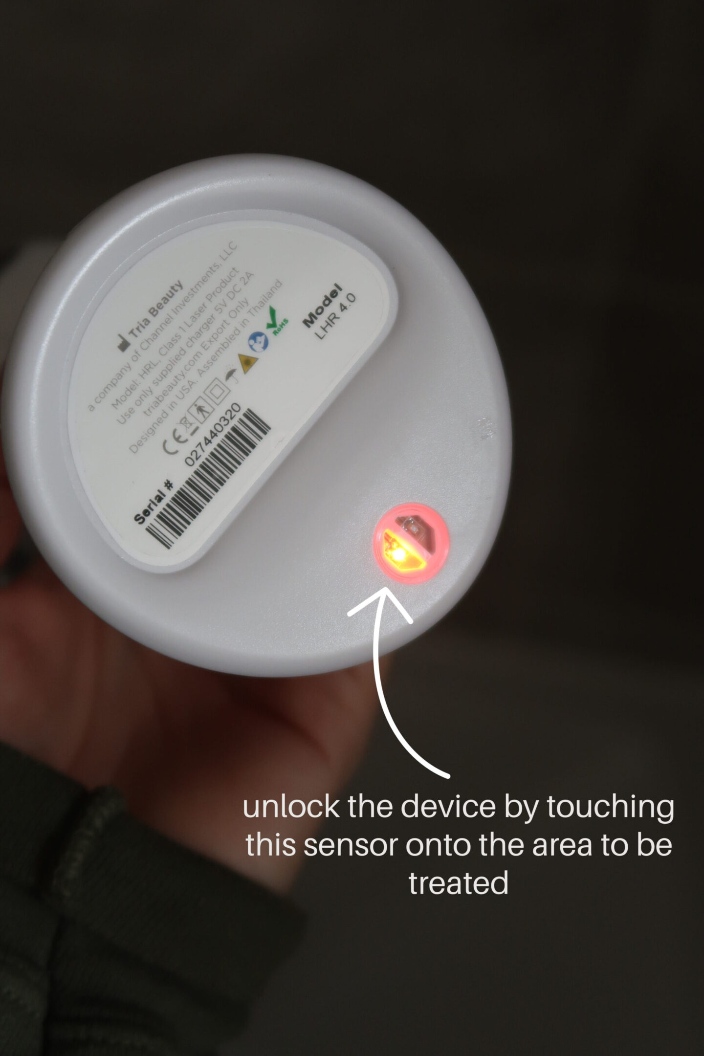 2.) Turn on the device by pressing on the pink button. The device will be locked at this point. To unlock your Tria 4X Hair Removal Laser, you’ll need to hold the Skin Sensor in the base of your device against the area of skin you wish to treat. If your skin tone is safe to treat, the device will unlock and you can begin your treatment. If it is not safe to treat, the device will remain locked.